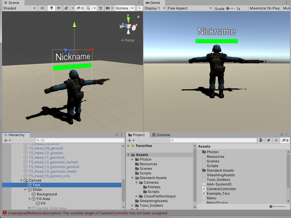 按下 Play 測試遊戲,本地端的玩家角色動態生成後,攝影機將會跟隨本地端玩家,而不是其他玩家。 若出現 UnassignedReferenceException: The variable target of CameraController has not been assigned. 錯誤訊息,無需理會。