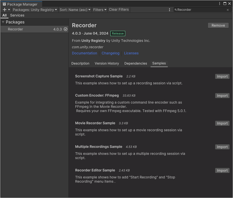 Unity Recorder 教學Author: Kelvin HuangUnity Recorder 是官方推出的 Unity 遊戲畫面錄影工具,可輸出影片檔、GIF 動畫、連續圖檔,適合製作遊戲動畫或宣傳影片。 開啟 Package Manager 搜尋 Unity Recorder 按下 Install 安裝。
