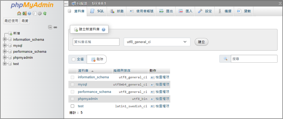 瀏覽器輸入網址 http://127.0.0.1/phpmyadmin