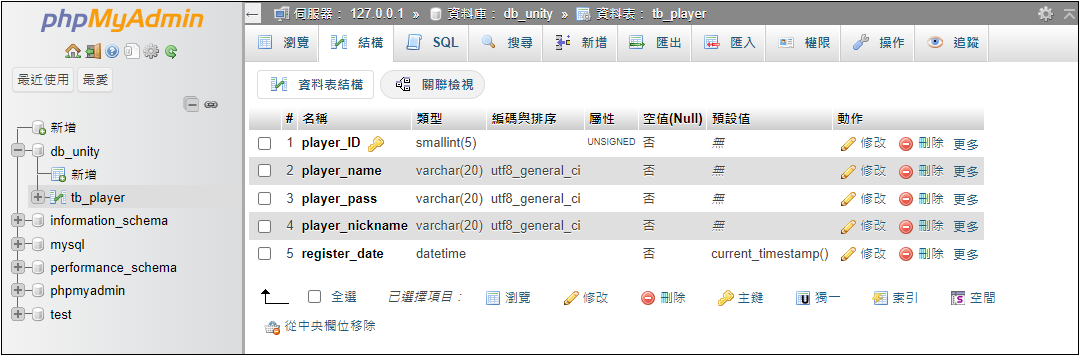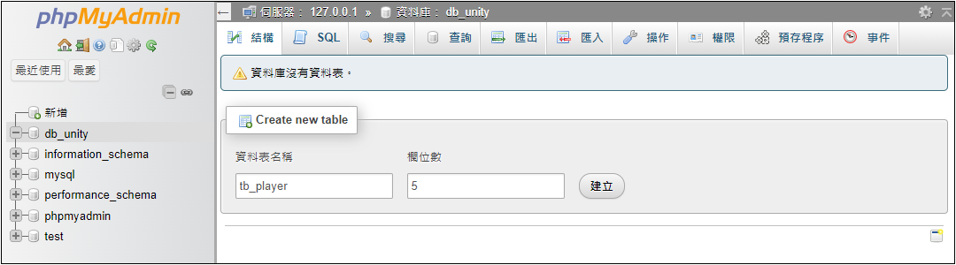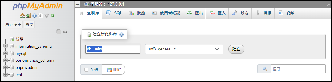 新增 db_unity 資料庫