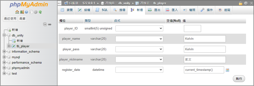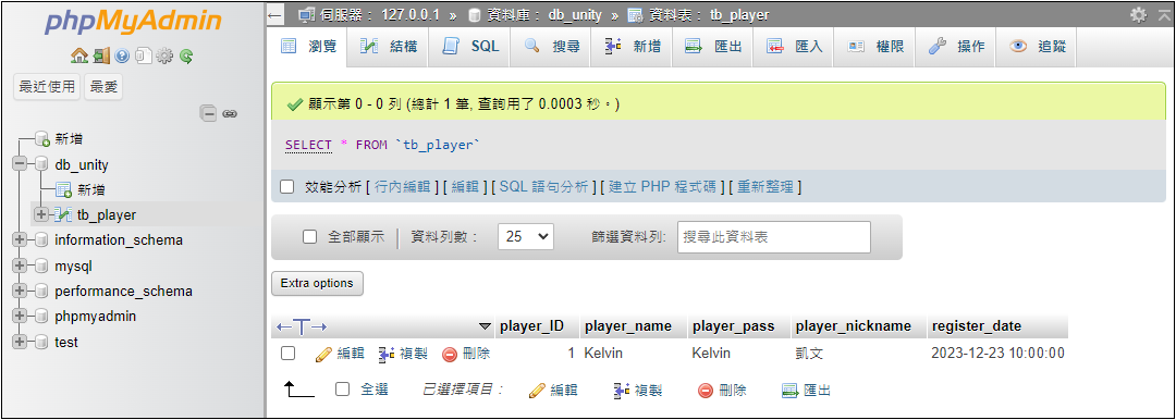 輸入網址測試,例如 http://127.0.0.1/UnityWebRequest/PlayerRegister.php?player_name=Kelvin&player_pass=777&player_nickname=凱文