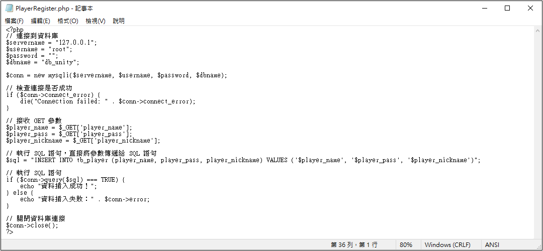 撰寫 PlayerRegister.php 網頁,用於接收包含帳號、密碼、暱稱的 URL 參數並儲存到資料庫。
