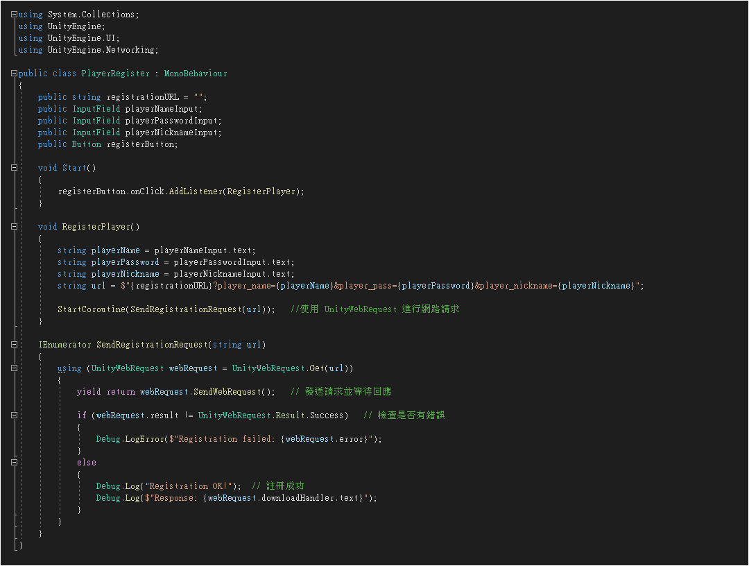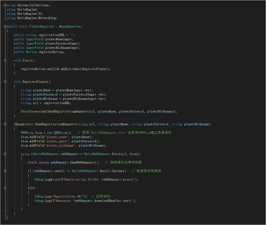 如果考量資安的問題,將 PlayerRegister.cs 腳本改用 POST 方式傳送。