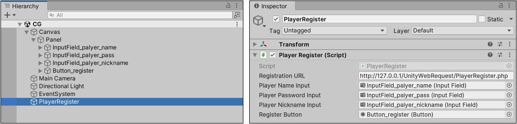 將 PlayerRegister 腳本指定給物件並設定文字輸入欄位