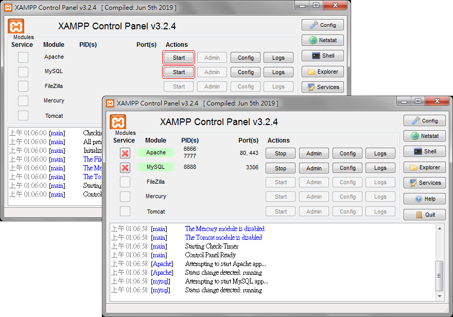 安裝完成後,開啟 Control Panel 控制面板,按下 Start 按鈕,啟用網站伺服器與資料庫。