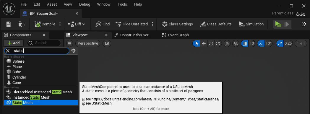 重新命名為 BP_SoccerGoal 藍圖,滑鼠雙擊開啟藍圖編輯器,按 + Add 新增 Static Mesh 靜態網格,用於製作球門的外觀。
