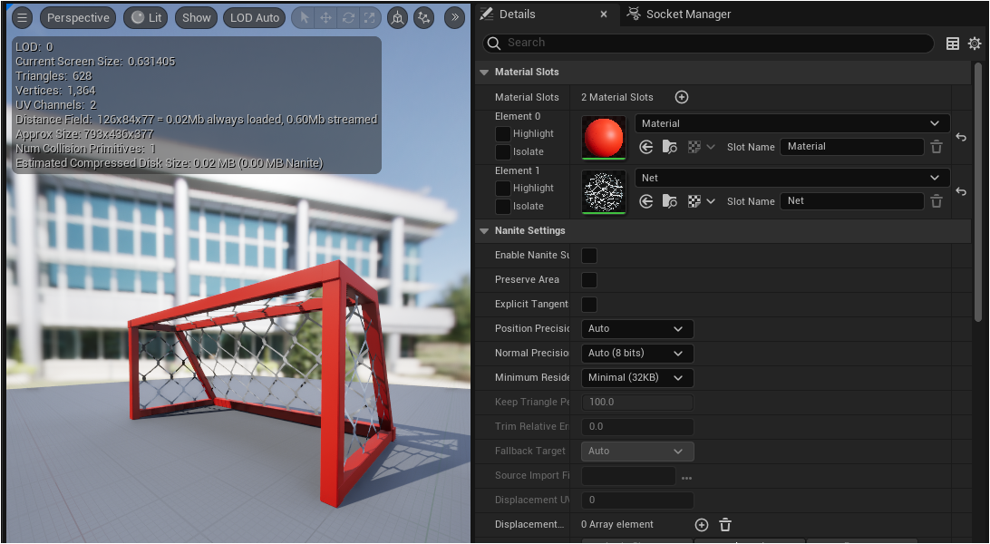重新命名為 SoccerGoal 並在 Details 設定 Static Mesh 使用自行準備的足球門模型。