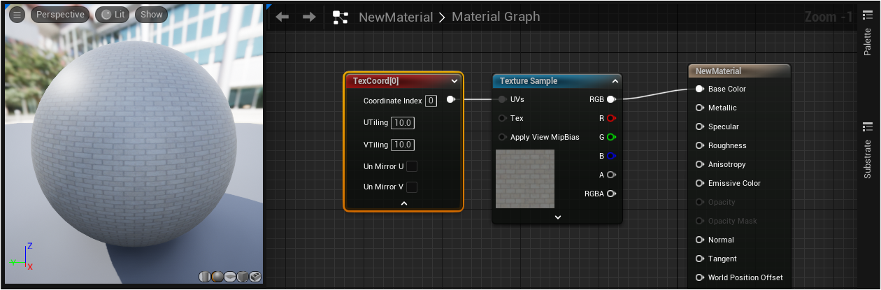 將 TexCoord 節點連接到 Texture Sample 節點的 UVs 引腳,預設值如下圖所示。