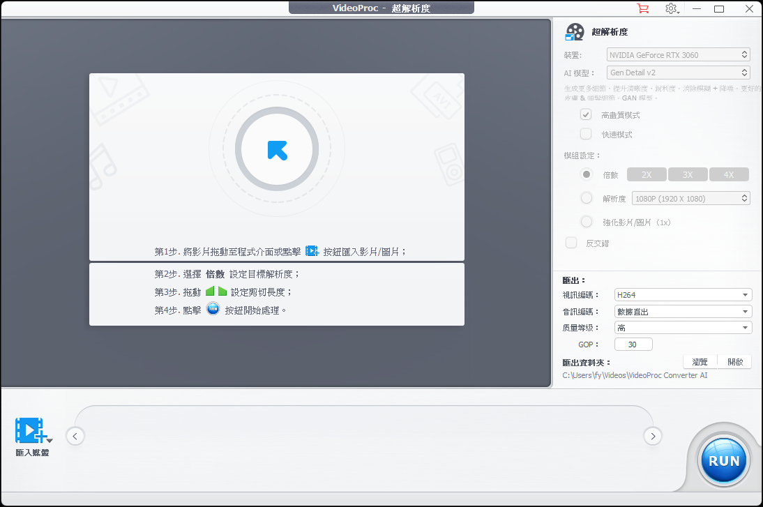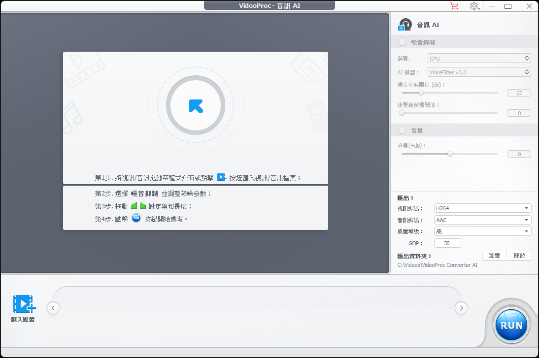 將影片或圖片拖曳至編輯區,或點擊左下方按鈕匯入。 可拖曳時間軸上的 In / Out 設定剪切長度。 設定視訊與音訊的編碼,匯出資料夾,然後按下藍色 RUN 按鈕開始處理影片。