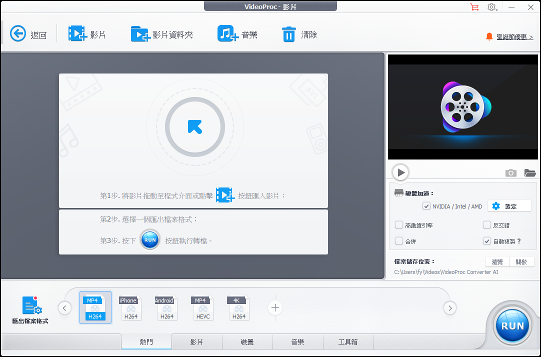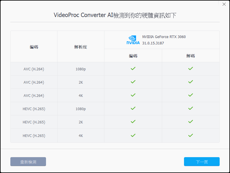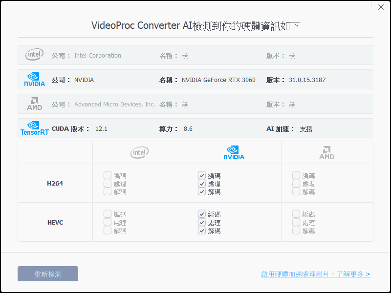 初次執行將對您的硬體進行檢測。例如 NVIDIA GeForce RTX 系列顯卡可䂮援 AI 加速、H.264 / HEVC 編碼解碼加速。