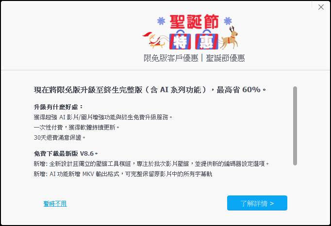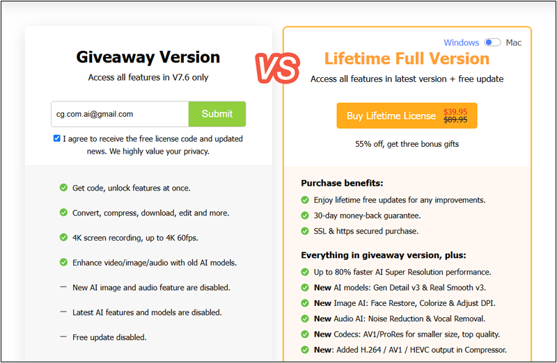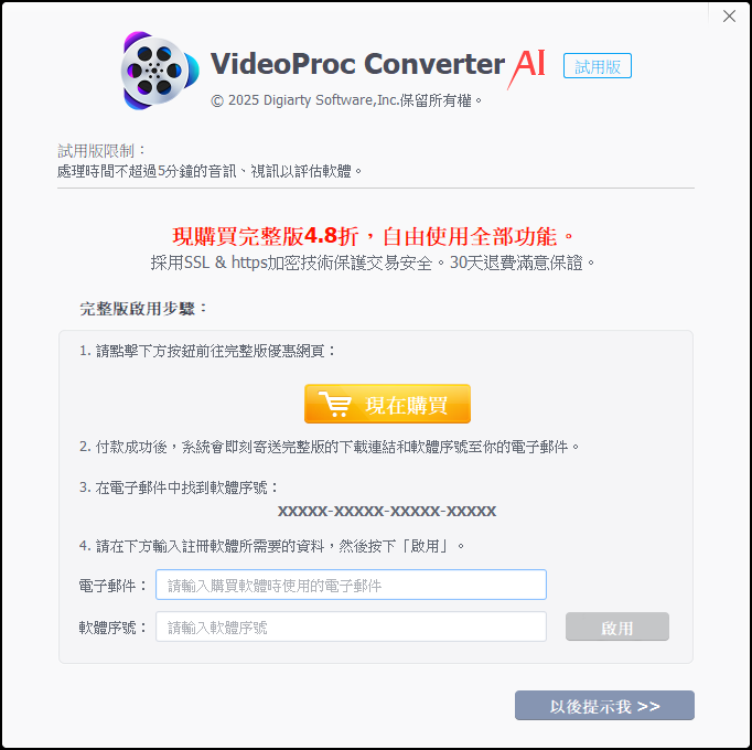 46 您可以透過 VideoProc Converter AI 限免客戶優惠,升級到終生完整版,只需一次性付費即可獲得終生免費升級服務。