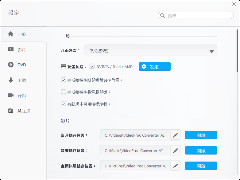 48 點擊齒輪圖示,可開啟 VideoProc Converter AI 設定,可以選擇介面語言、硬體加速、 影片音樂畫面快照的儲存位置。