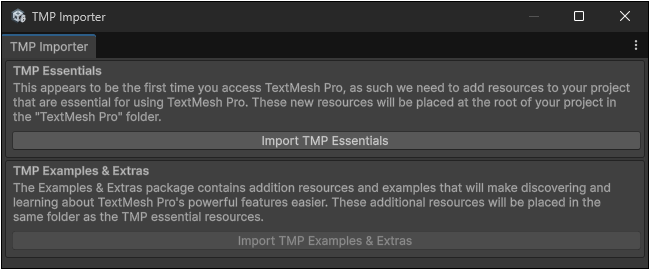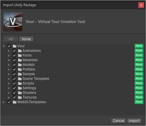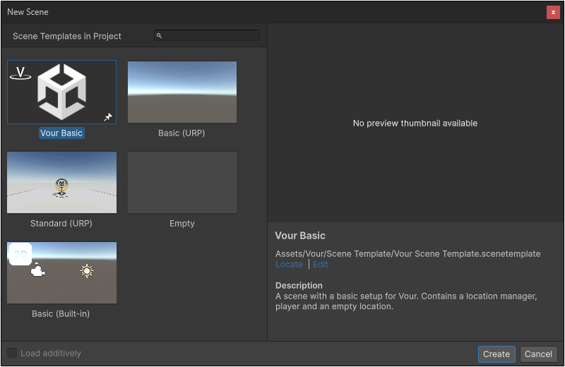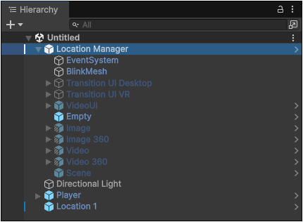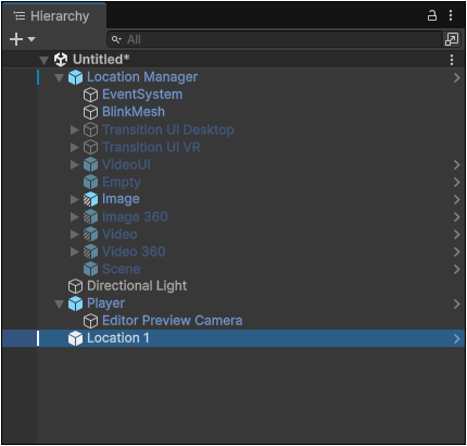此場景已有 Location Manager, Player, Location 1 物件,與舊版 Vour 需要手動新增,簡化了操作步驟。另可匯入 TextMesh Pro 。