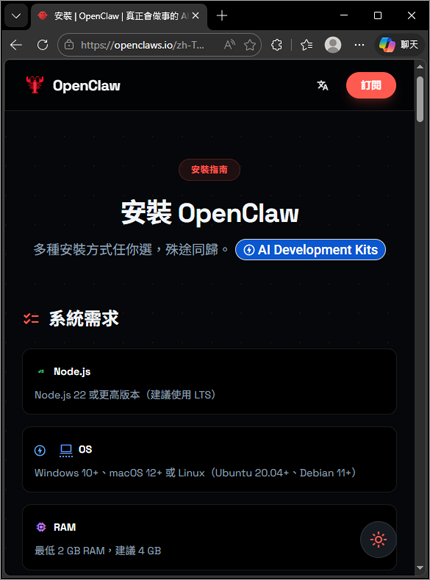OpenClaw 安裝教學您可以從目前使用的作業系統選擇看下教學: [ OpenClaw macOS 安裝教學 ] 或是 [ OpenClaw Windows 安裝教學 ]