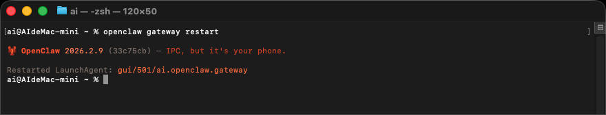 請在終端機執行 openclaw gateway restart 重新啟動!